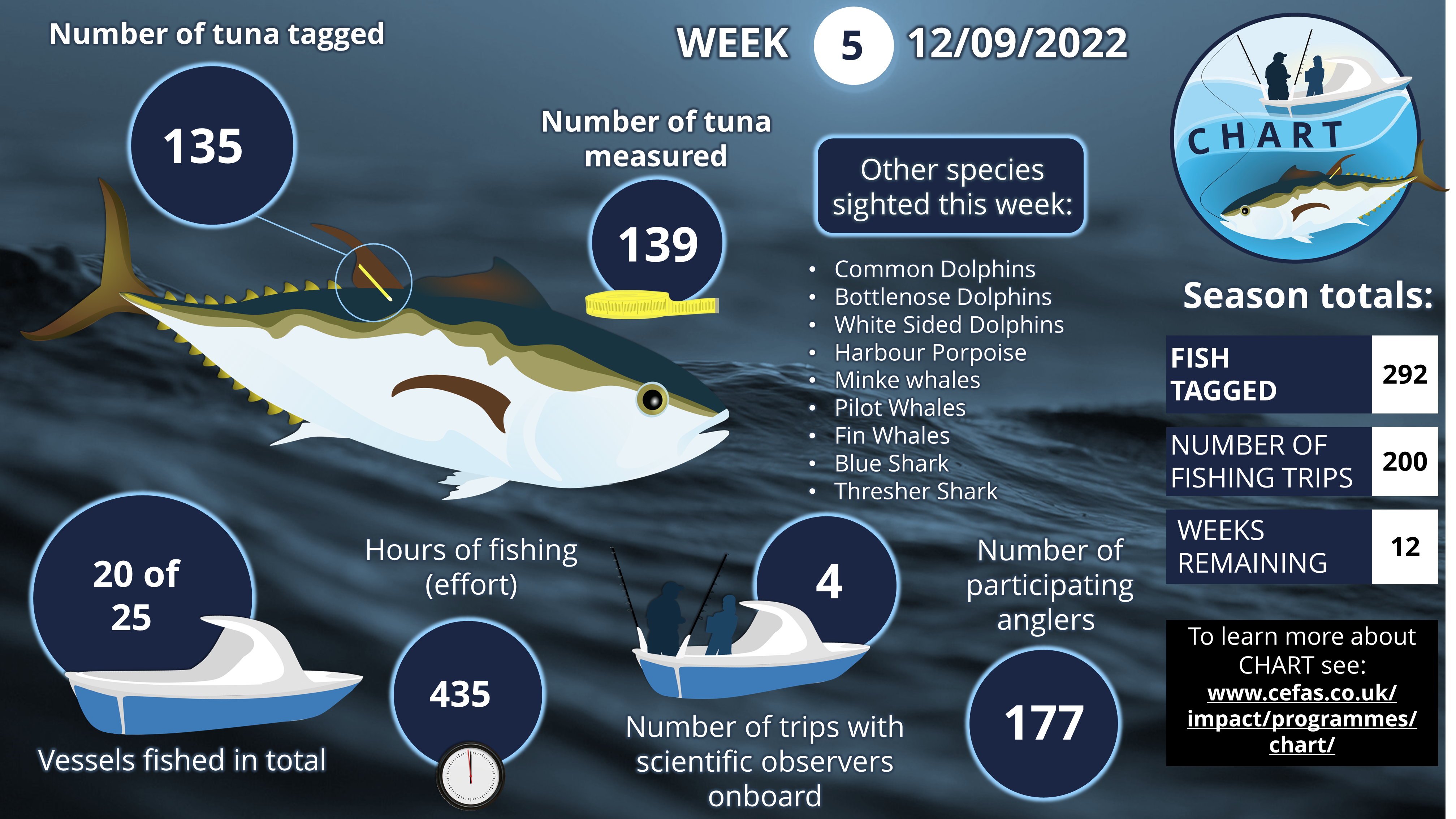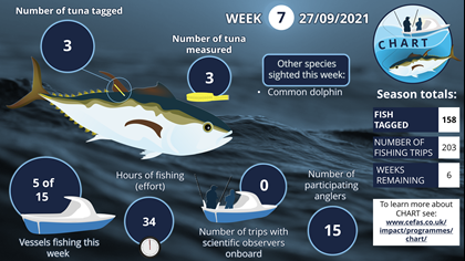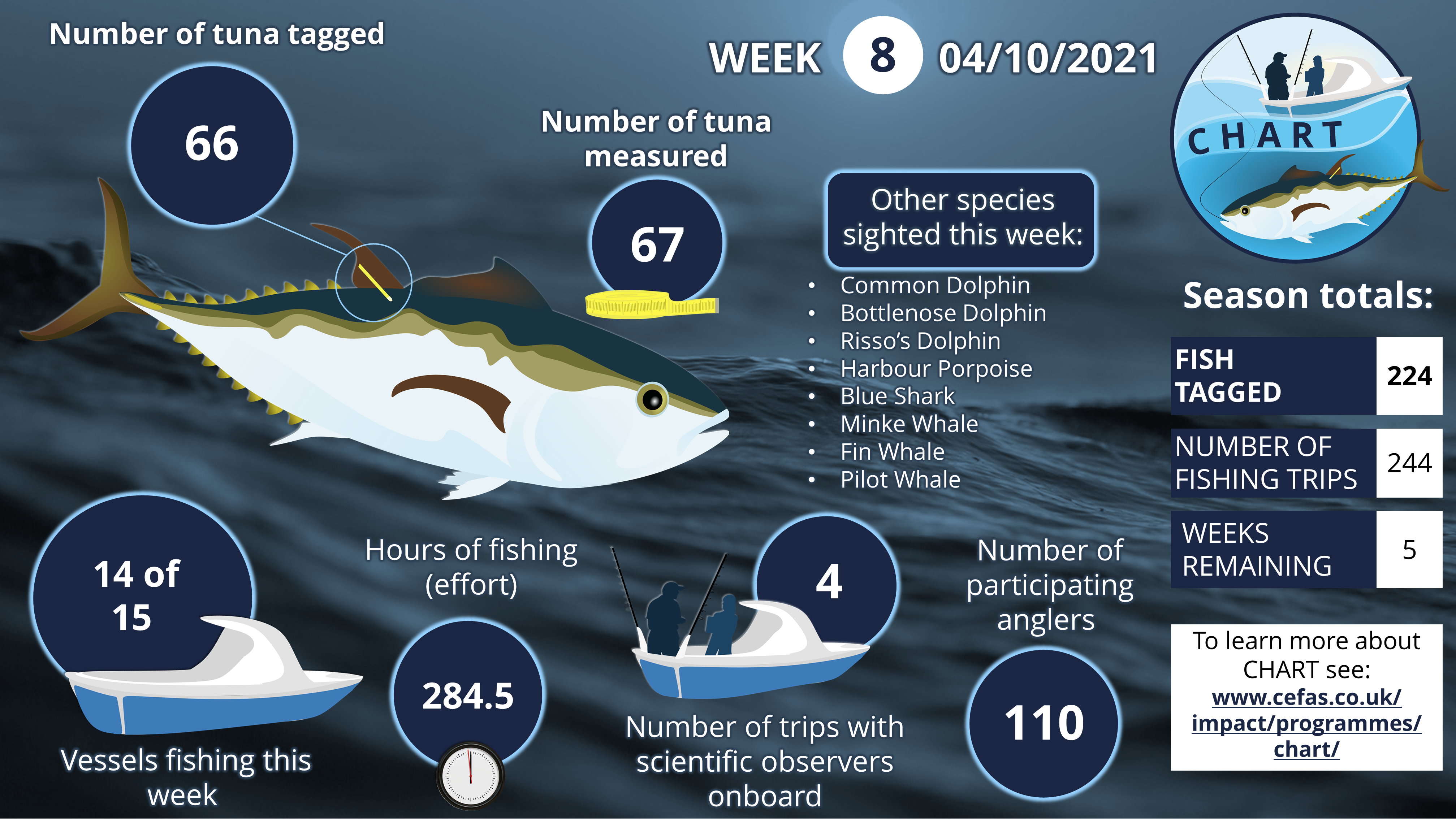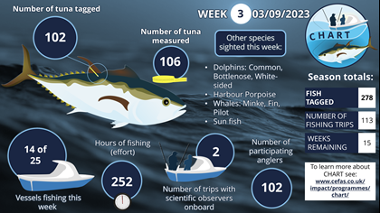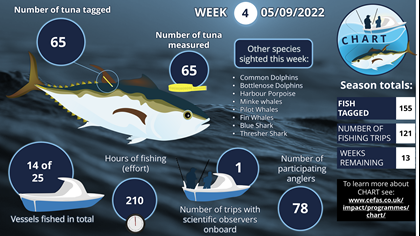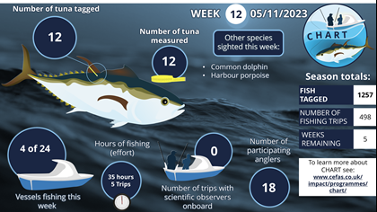 In recent years, the number of sightings of Atlantic Bluefin Tuna (BFT) in UK waters has been increasing. This has led to a growing interest in the species from the science community, the recreational fishing community, and the commercial fishing sector. Following consultation between these stakeholders that began in 2020, the first co-designed CatcH And Release Tagging (CHART) programme for Atlantic Bluefin Tuna (BFT) was piloted in English waters in 2021. In 2022 CHART was expanded to include 25 charter vessels, operating from mid-August to mid-December. This expansion of CHART has led to over 1700 tags being deployed over the two seasons culminating in 1052 dedicated CHART fishing trips with over 2800 paying anglers participating in the programme.